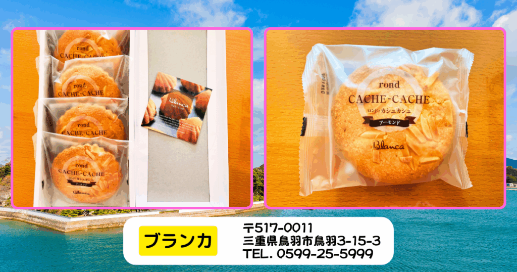 三重県鳥羽市の洋菓子店「ブランカ」さんの人気商品です。rondは「丸い」、cache-cacheは「かくれんぼ」。生地の中にアーモンドが顔を出したり引っ込んだりする様子からその名前が付いたそうです。