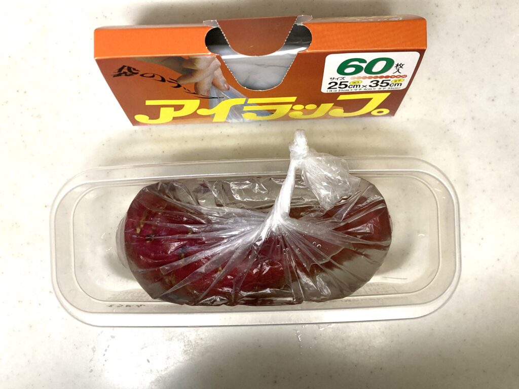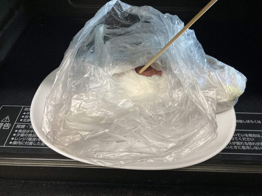 - 新しいアイラップにさつま芋をいれ、耐熱皿の上にのせて、袋をふんわり折りたたみ、レンジで加熱していきます。