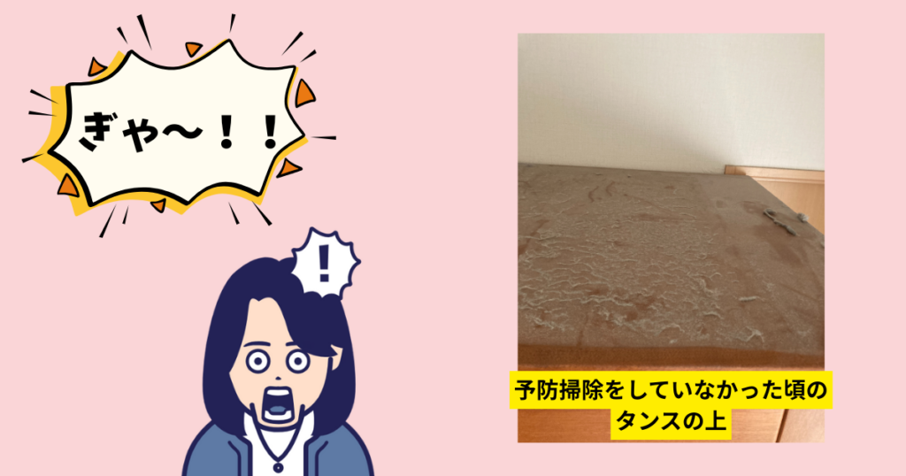 これは一例ですが、なにもしなければたんすの上はこんなにも埃が😫
