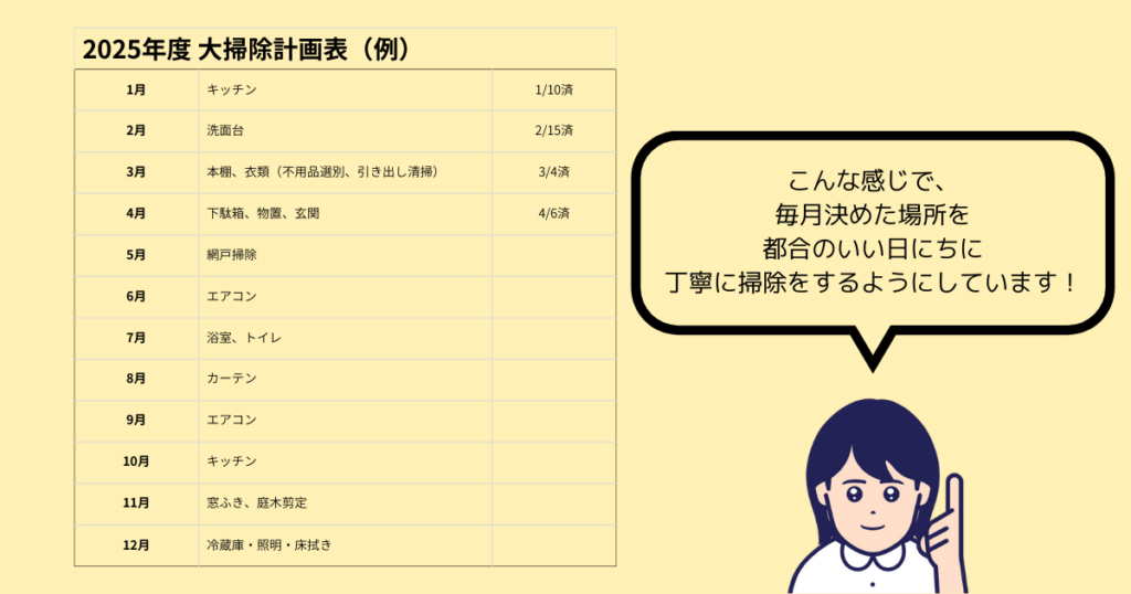 • 12月: 寒いので室内中心に「冷蔵庫・照明・床拭き」など