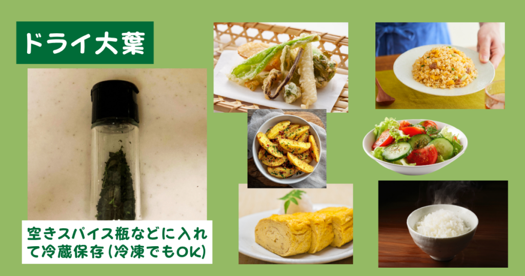 ドライ大葉の方は、お塩と混ぜて大葉塩にするのが私のお気に入りです。